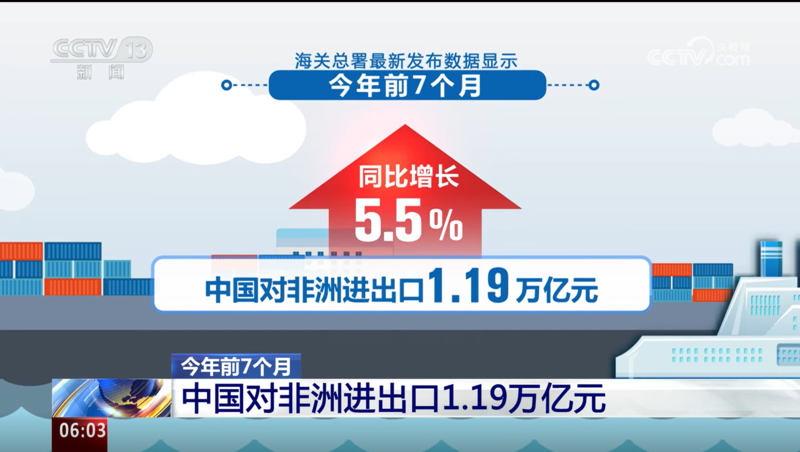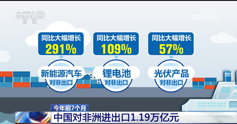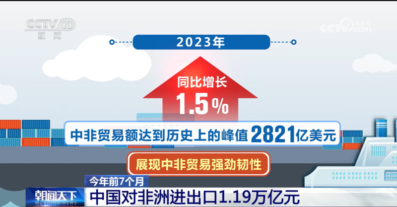 今年前7个月 中国对非洲进出口1.19万亿元发表时间:2024-08-30 10:36 央视网消息(朝闻天下):非洲产的牛油果、咖啡、橡胶,中国造的手机、电动车、起重机……近年来,越来越多中非好物漂洋过海,“飞入寻常百姓家”,中非贸易往来更趋紧密。