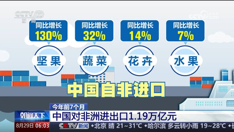 海关总署最新发布数据显示,今年前7个月,中国对非洲进出口1.19万亿元,同比增长5.5%。2023年,中非贸易额达到历史上的峰值2821亿美元,同比增长1.5%,展现中非贸易强劲韧性。其中,中国自非进口坚果、蔬菜、花卉、水果同比分别增长130%、32%、14%、7%;新能源汽车、锂电池、光伏产品对非出口同比大幅增长291%、109%、57%。